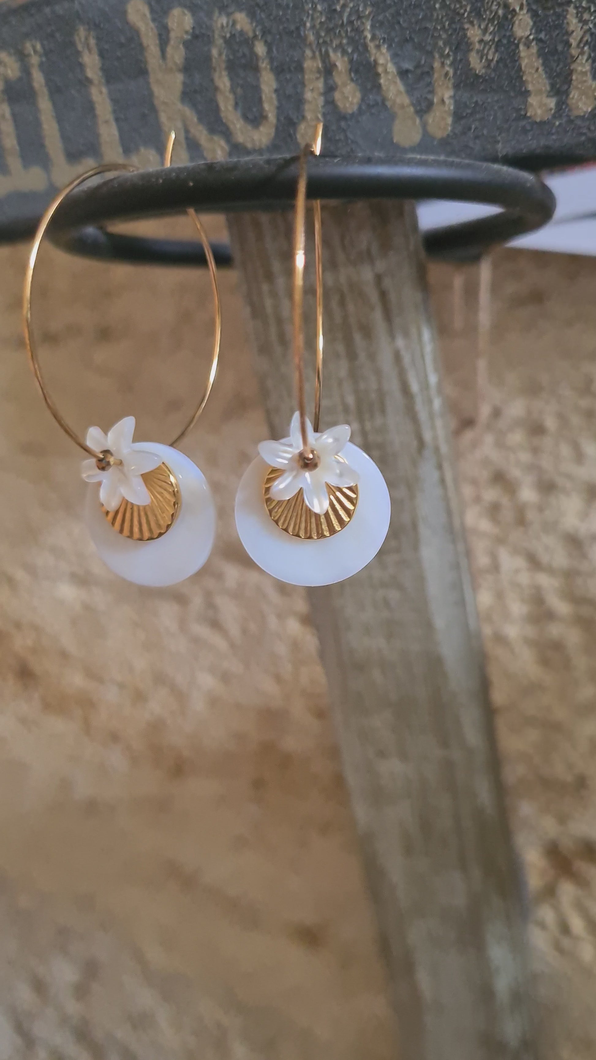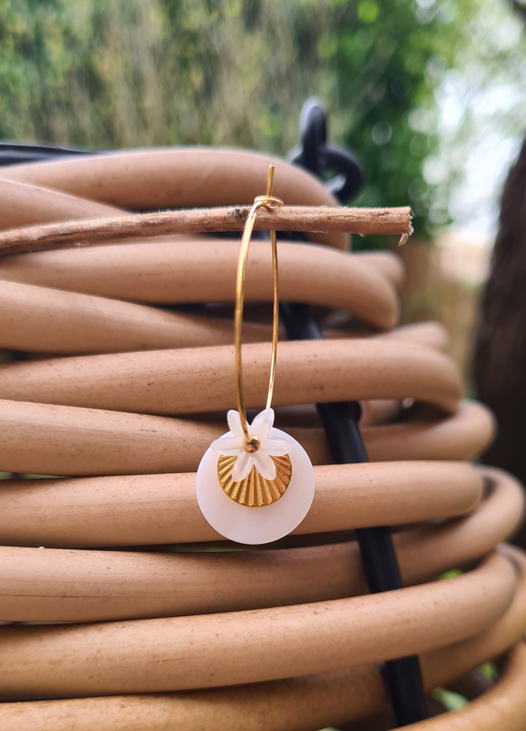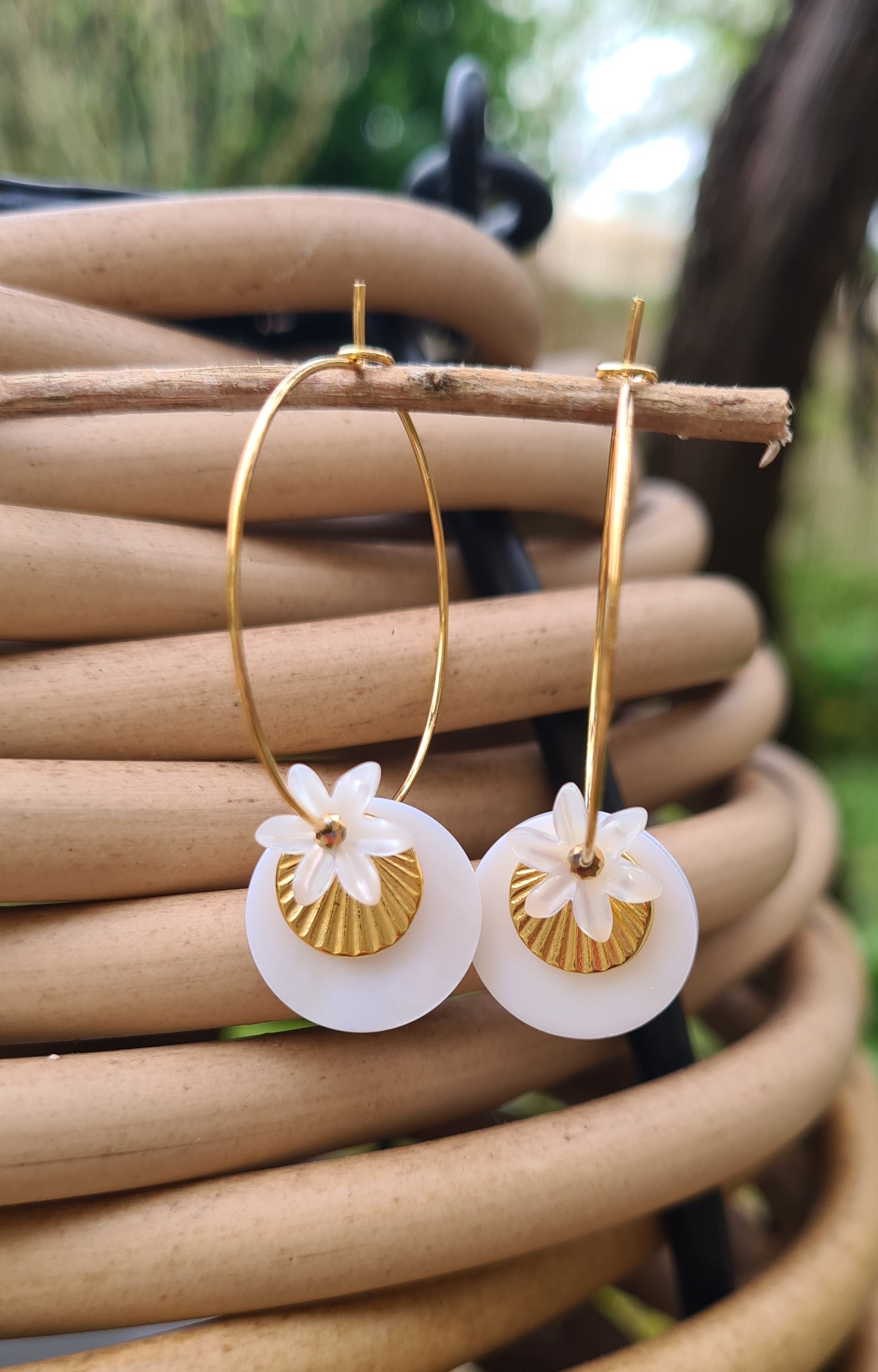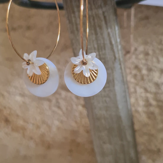 Les créoles Alix, une superposition d'un sequin de nacre, sequin soleil doré à l'or fin 24kt, fleur de nacre et petite perle en hématite dorée en son coeur.