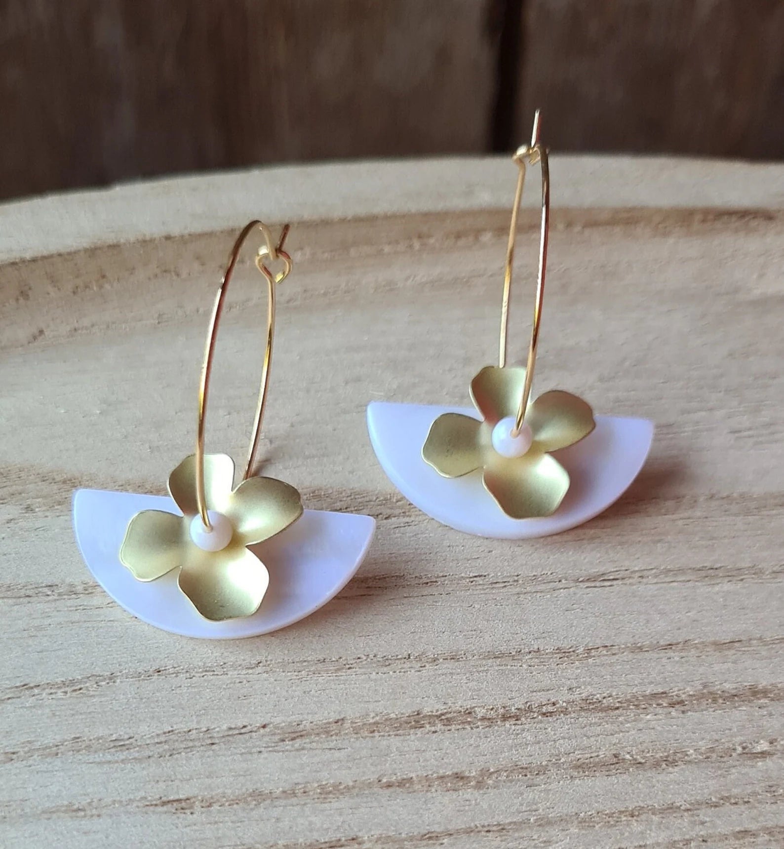 Boucles "Vahiné" demi-lune nacre et fleur montées sur créoles dorées à l'or fin 24kt