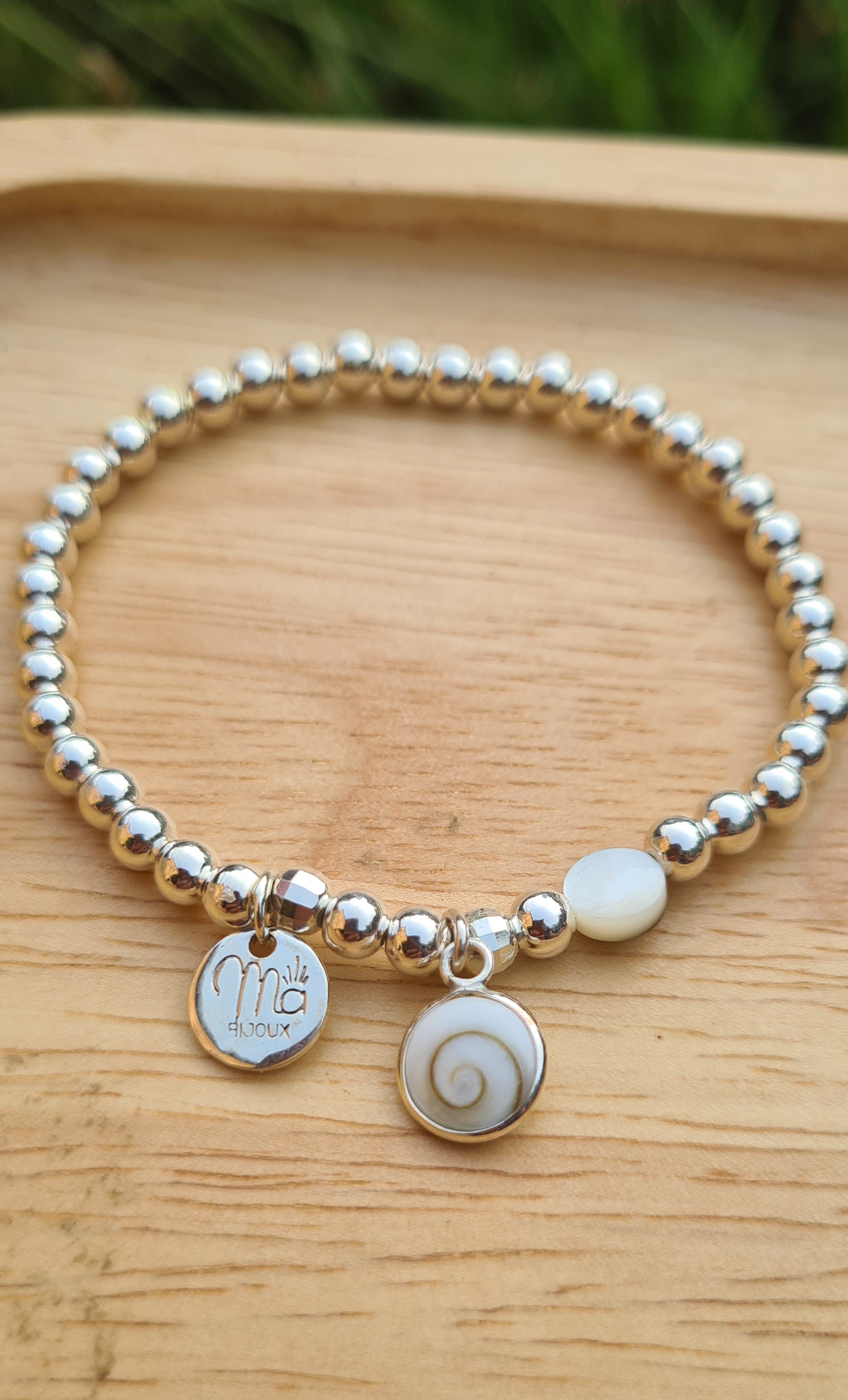 Bracelet réalisé avec des perles rondes 4mm en argent 925, une perle nacre de Tahiti, une breloque œil de Sainte-Lucie sertie d'argent 925 et mon logo Mabacca en argent 925.