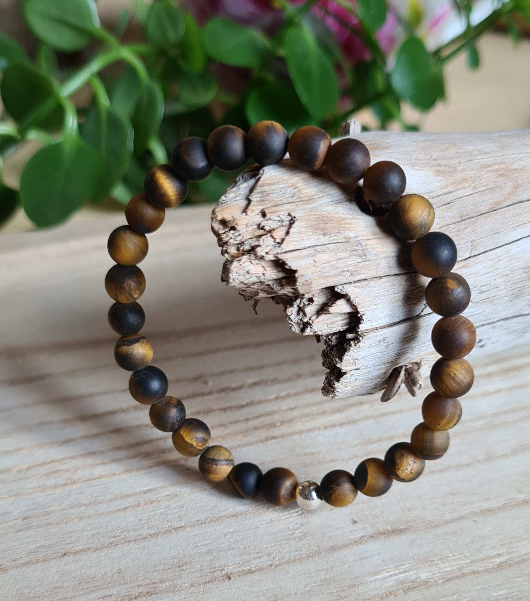 Bracelet fait main en pierres naturelles œil de tigre dépoli de 6, 8 et 10mm de diamètre, montées sur fil élastique très résistant sans fermoir.