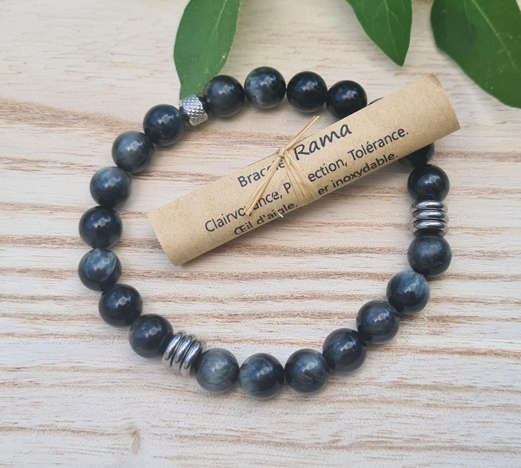 Bracelet fait main en perles de pierres naturelles de 8mm de diamètre en Oeil d'aigle, acier inoxydable, monté sur fil élastique très résistant sans fermoir.