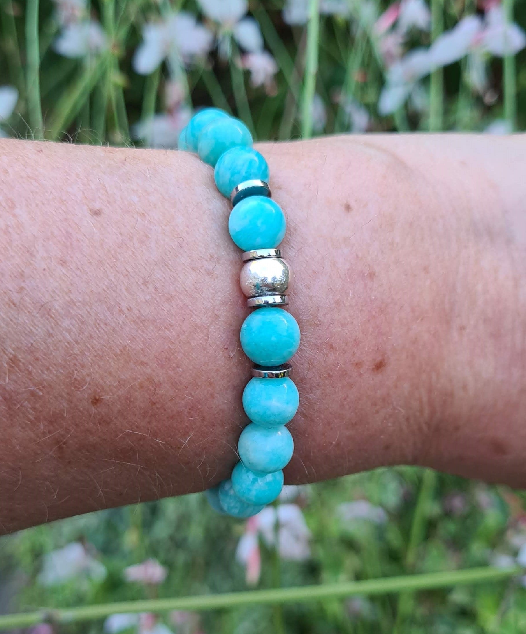 Bracelet fait main en perles de pierres naturelles de 8mm de diamètre, de rondelles d'hématite et une perle en zamac, monté sur fil élastique très résistant sans fermoir.