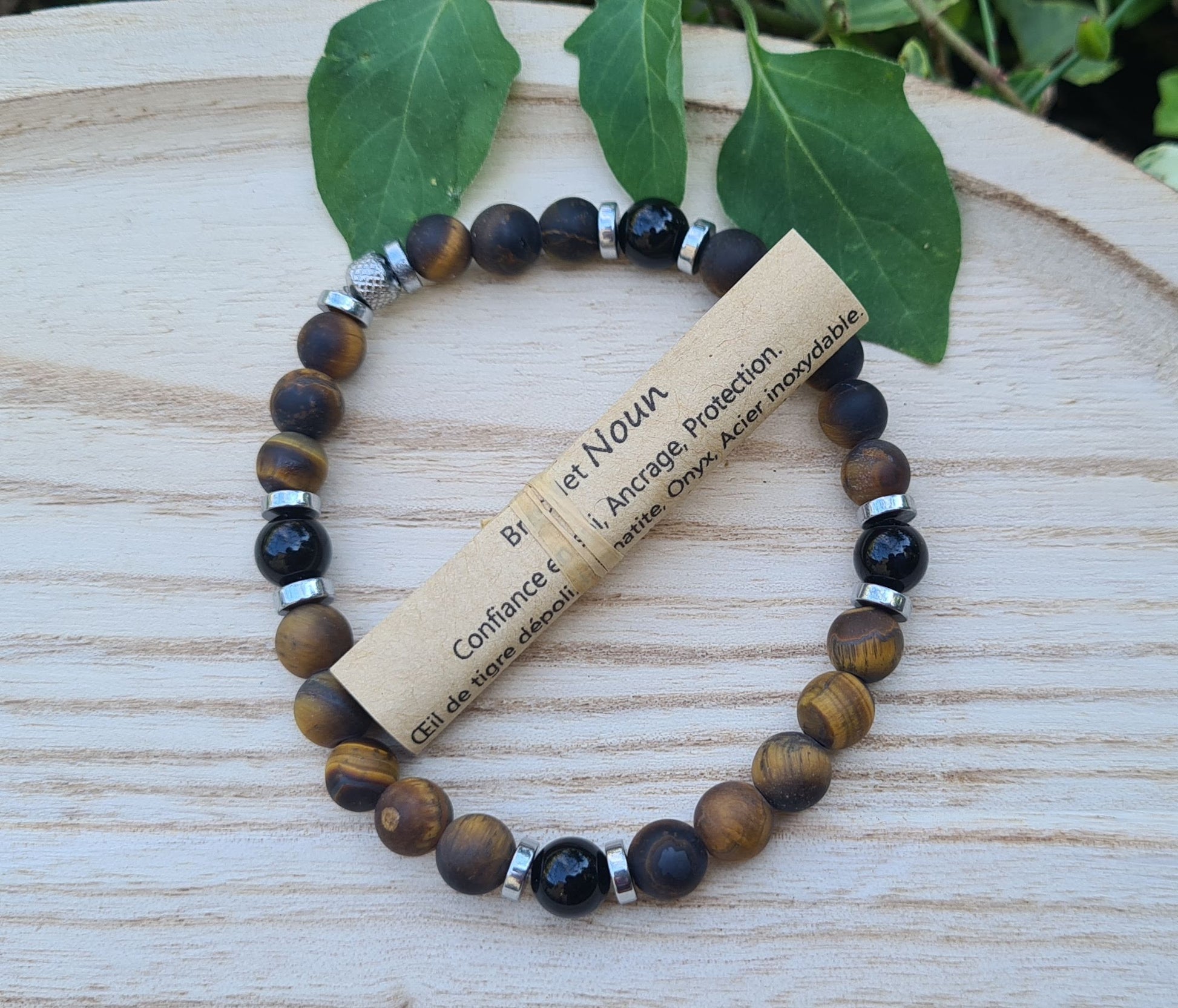 Bracelet "Noun" Onyx, Oeil de tigre dépoli et Hématite 8mm