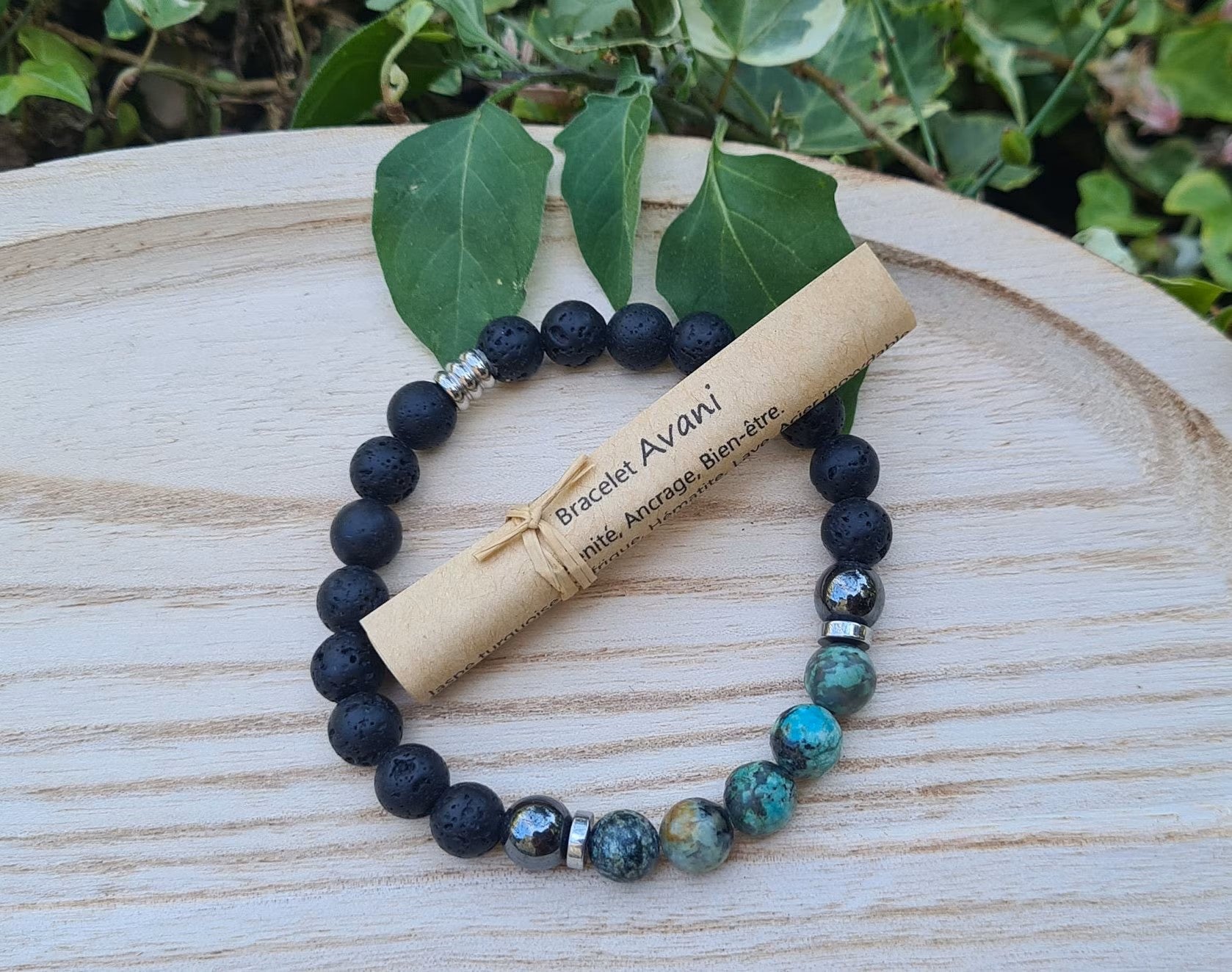 Pierre de lave, Jaspe turquoise d’Afrique, Hématite, Acier inoxydable composent ce bracelet.